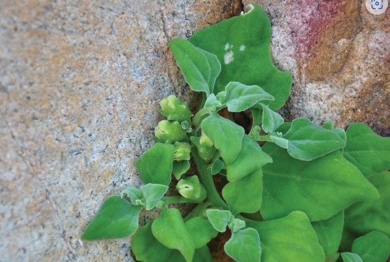 온몸에 작은 점이 빽빽하게 나 있는 줄기는 땅에 엎드렸다가 점차 일어서며 50cm 정도의 높이로 자라나 약간의 가지를 친다. 두껍게 살이 찐 잎은 서로 어긋나게 자리하고 있으며 계란 꼴에 가까운 마름모이고 끝이 뾰족하다. 잎의 가장자리에는 톱니가 없고 밋밋하게 되어 있다.